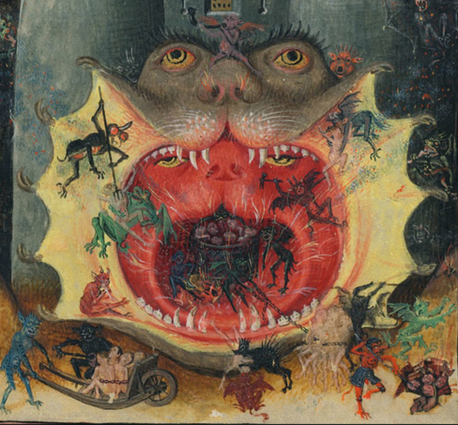 Style being open, inspiration choice being blend Isabella Breviary and Hours of Catherine of Cleves. Interpretation Cleves Hellmouth into Cthulhu mouth.. Main image being “Duel at Gates of Hell.” Tentacles from Cthulhu mouth become intertwining vines similar to Isabella border works. Recognition being is “similar” but nowhere near “duplicative.” Text works also being follow Isabella illuminated text pages with balanced layout and “space fill” illuminations.