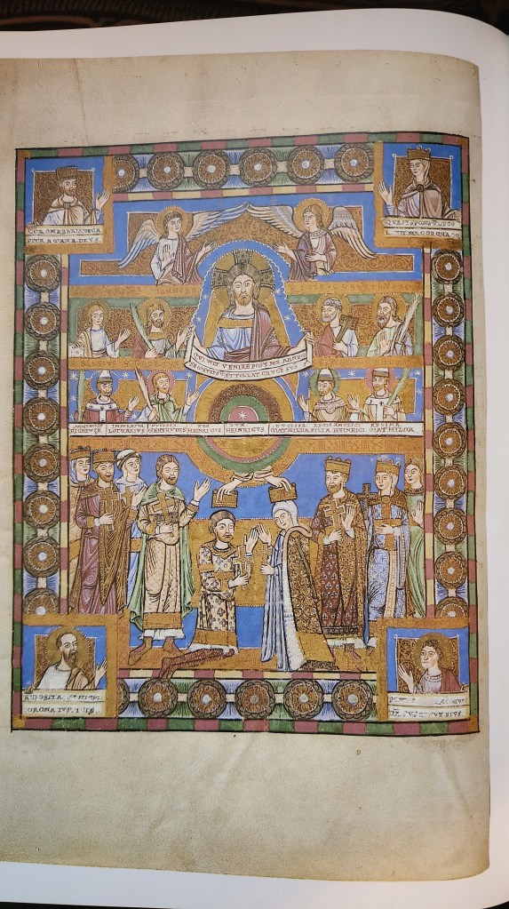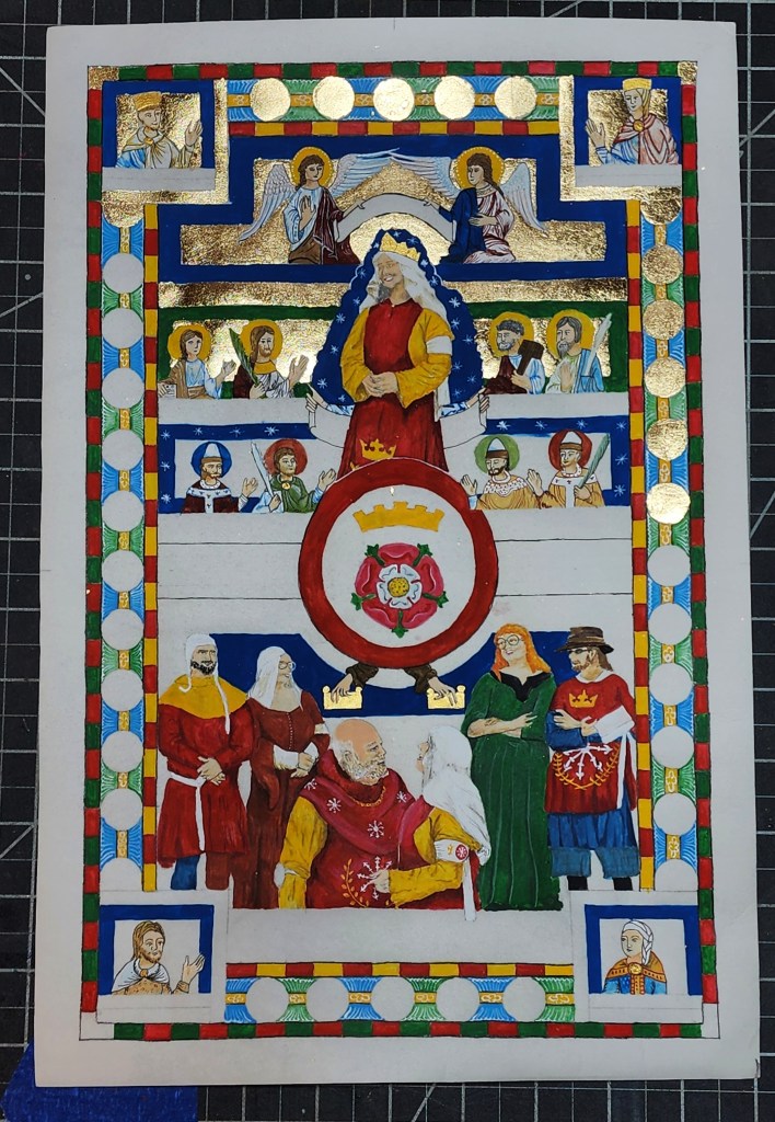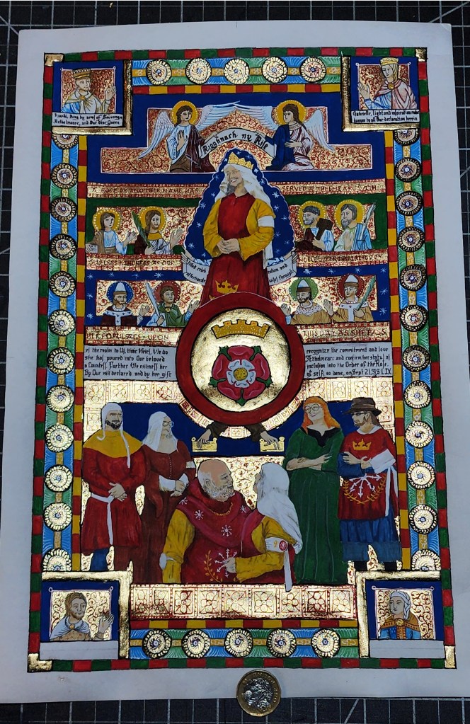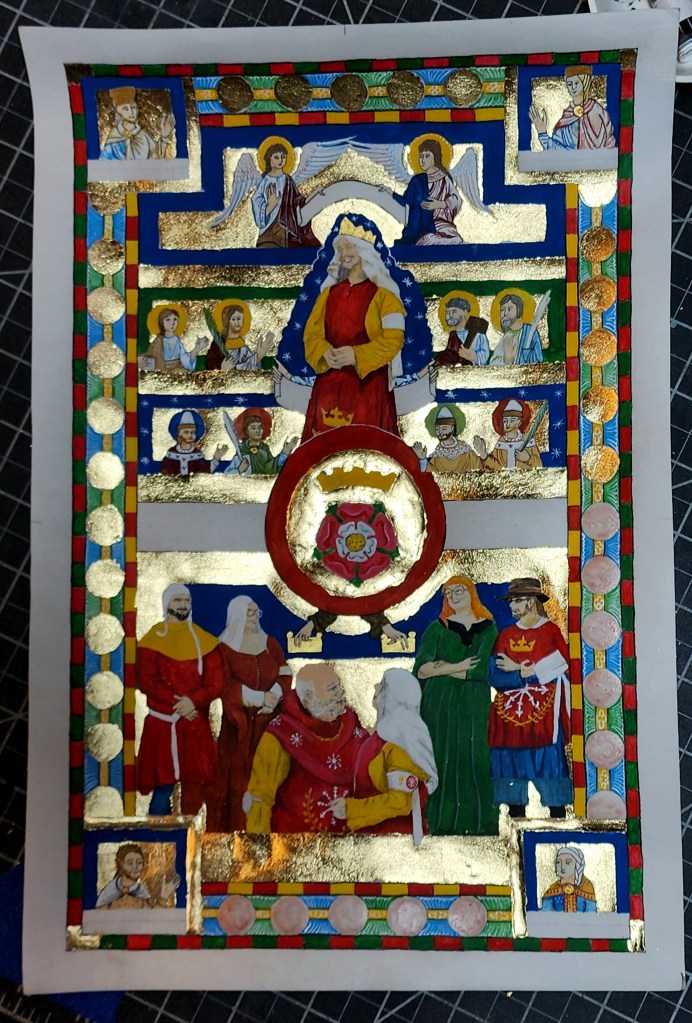 Inspiration being folio 171b – coronation by Christ of Henry the Lion and Matilde of England. Primary image of Christ at top replaced by Recipient in more modern portrait technique. Similarly, choice of Coronation scene – replacing 12th C style by realistic-image style of Royals, Heirs and important subjects. Remaining Portraits remaining in 12th C style, and central design to focus on symbology of Rose and County Coronet. Attached to this post being images used as inspiration and guides for design and portrait choices.