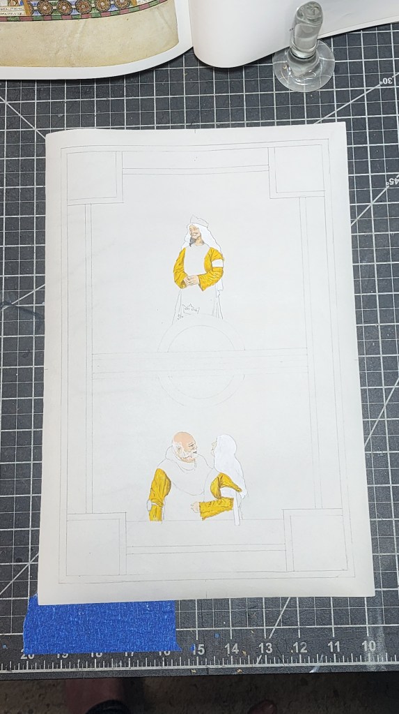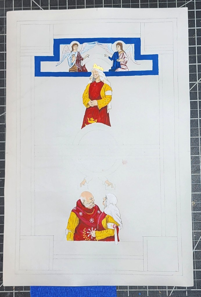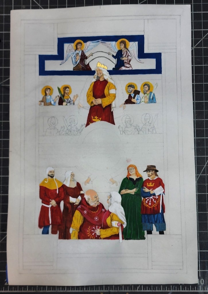 Base sheet being sheep parchment, very lovely working with, minimal issues of accepting gesso and paint. Much gold leaf used. More learning with Gesso and layers, struggles happening but finding solutions with more practicing.
