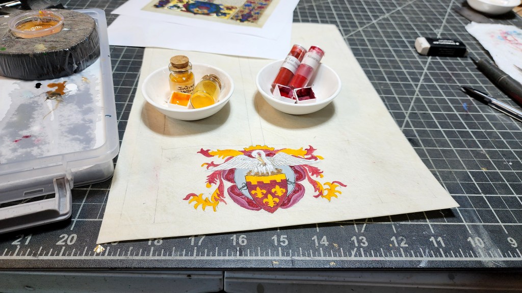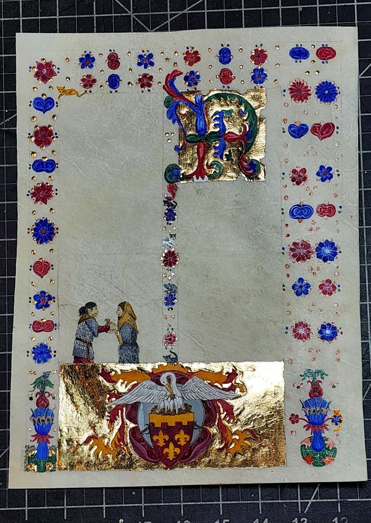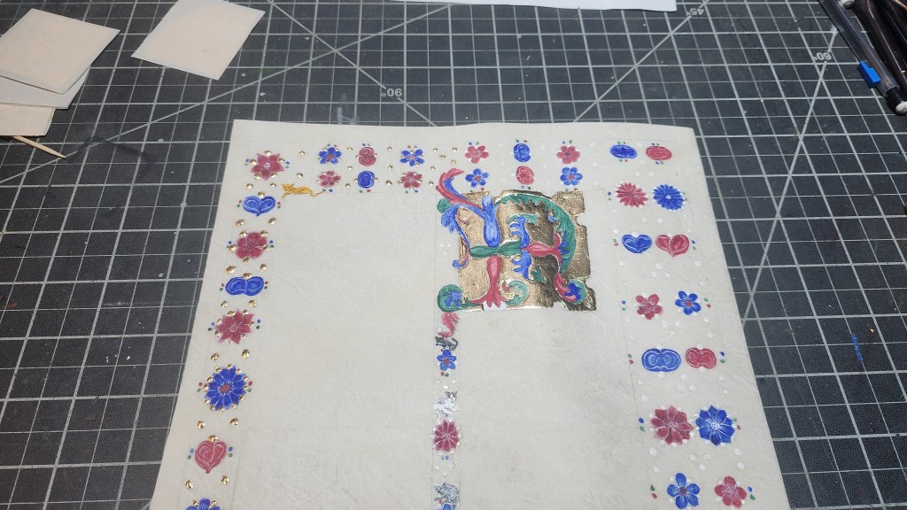 Materials being cattle vellum, natural pigments, 24 k gold leaf with Gesso. Focus for assignment being stay on period techniques throughout. Vellum from Patron thicker than most, heavy. Even with preparation, cleaning, buffing and pouncing, struggles with ink. Ink being walnut, infused with lamp black, for reason to decrease bleed and consistency, as well as dark. Applied with quill pen, finding am happiest. Quill having smaller reservoir than modern, but also seems having more consistent, as constant reload and prep-swipe flowing better. Just needing more patience. Red ink being same red as used for paint, mixed thinner.