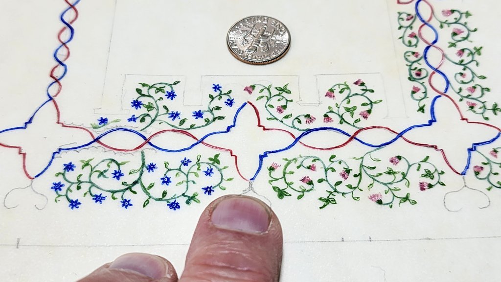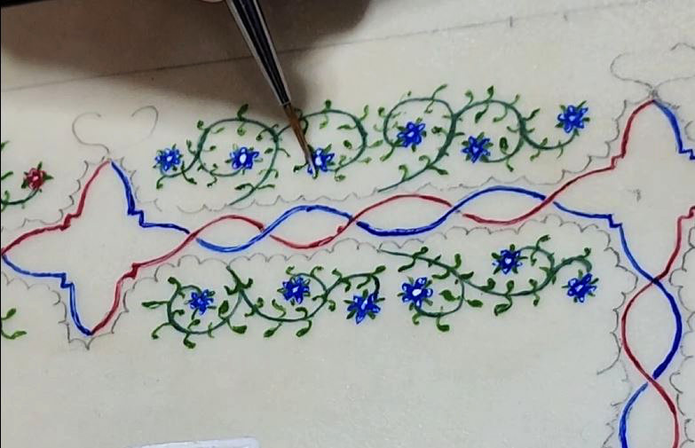 Inspiration has cyclic color around border, various flowers, alternating blues and reds. Decision to work details of flowers allowed for practice using new liner brush: citadel fine detail. Brush allows for application of lines less than 1mm and fine highlight detail on flowers. Each flower approximately 2 – 3 mm in diameter, each one with multiple shades and highlight. Discovered blending technique for letting reactivation of wet pigments. Reactivation cause difficulty in larger area, but wonderful blending opportunity in smaller. First use of ‘lead red.’ Oh, this is absolutely beautiful color!!!