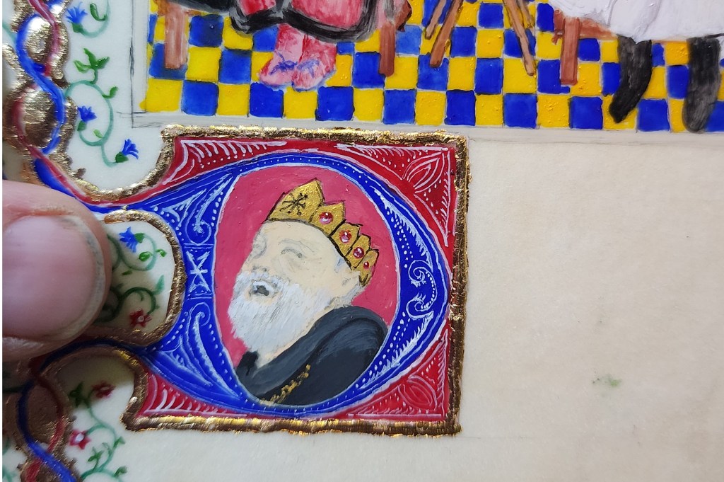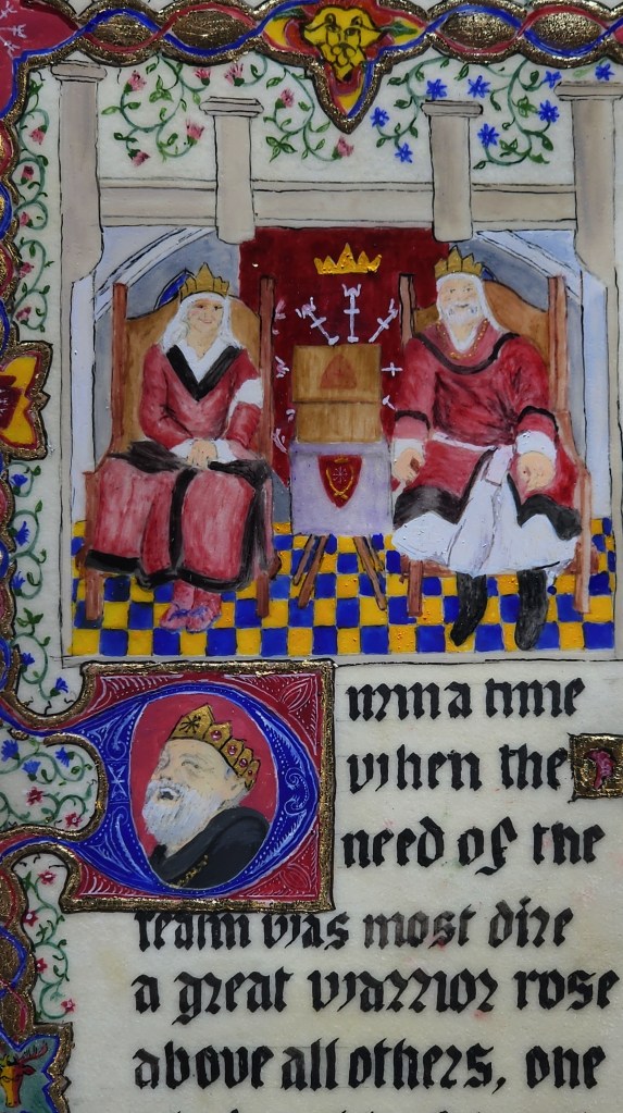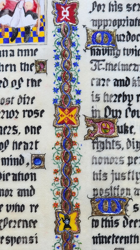 Requested assignment: Ducal Rank, Murdoch Bayne, Kingdom Aethelmearc. Choice for inspiration: Tres Riches Heures du Duc du Berry – “hours of the Virgin, The Angel brings food to the Virgin in the Temple”. c 1412 Animal vellum, period pigments, gum arabic binder. Iron gall ink applied with quill.