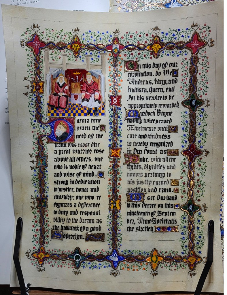 During a time when the need of the realm was most dire, a great warrior rose above all others, one who is noble of heart, and wise of mind, strong in dedication to justice, honor and Chivalry; one who recognizes a deference to duty and responsibility to the dream as the hallmark of a good Sovereign. On this day of our coronation, do We Andreas King, and Kallista, Queen, call for his service to be appropriately rewarded. Murdoch Bayne, having twice served Aethelmearc with care and Kindness is hereby recognized in Our Court as Duke, with all the rights, dignities and honors pertaning to his justly earned position and rank. We set our hand to this decree on this ninteenthe of September, Anno Societatis the sixtieth.