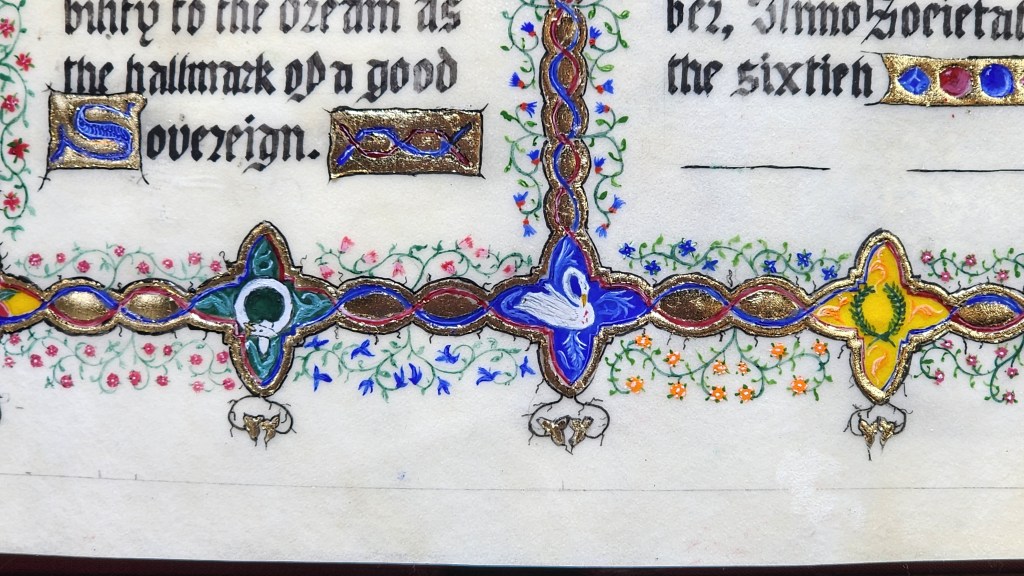 Choices for miniatures come from images captures in book of Faces. Attempts for portraiture challenge due to size and materials chosen. Many open small miniature windows in borders of exemplar. Choice using Kingdom awards, while also repeating Lion-on-Rose for personal notice. Across bottom – Knight, Laurel, Pelican, other grant and armigerous awards up verticals. Ducal and armorial in center along top.