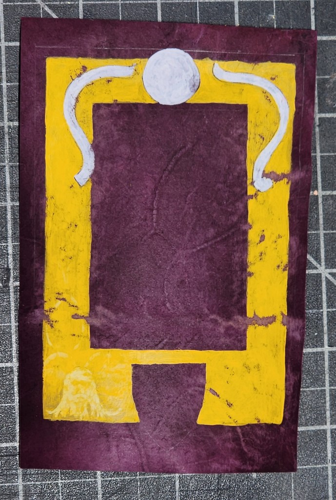 Design work with shell gold and liner brush. Patterns freehanded, taken from inspiration piece. Slightly more color used for increased interest. Arms for recipient and badge, required layer gesso to offset previously articulated uniformity issues.