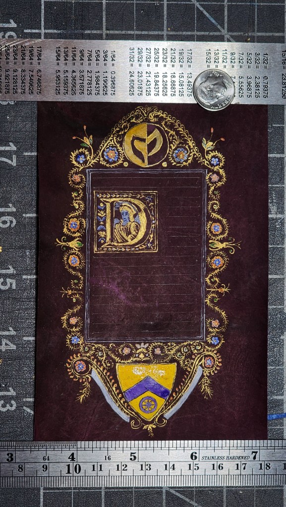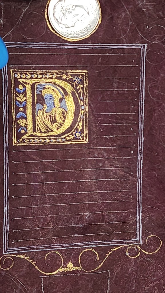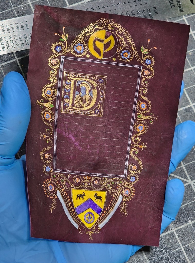 Goal 2 and 3 – Both success and failure. First attempt with Durazzo hours. Struggles with yellow pigment and even distribution. Tried layer gesso and still color uniformity unachieveable. Given time factor, unable to experiment to find appropriate layering technique for same-color shading illumination style for exemplar page. Fortunately, remaining page sufficiently treated on both sides, allowing use of verso. With time of essence for delivery, decision made changing inspiration to Cardinal Carafa hours.