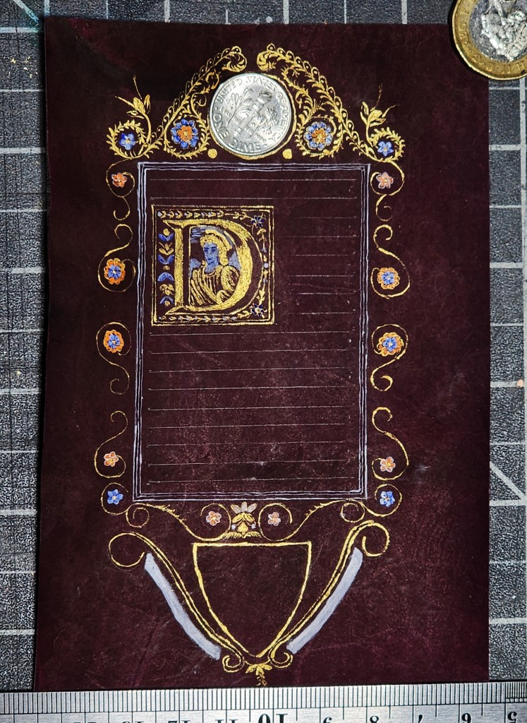 Style much fun, very much more learning needed for mastery. Practice being informant of training, Patron asks for more commissions with technique. Micro-work challenging. Gearing up for more dying of vellum, expecting another video of methods.