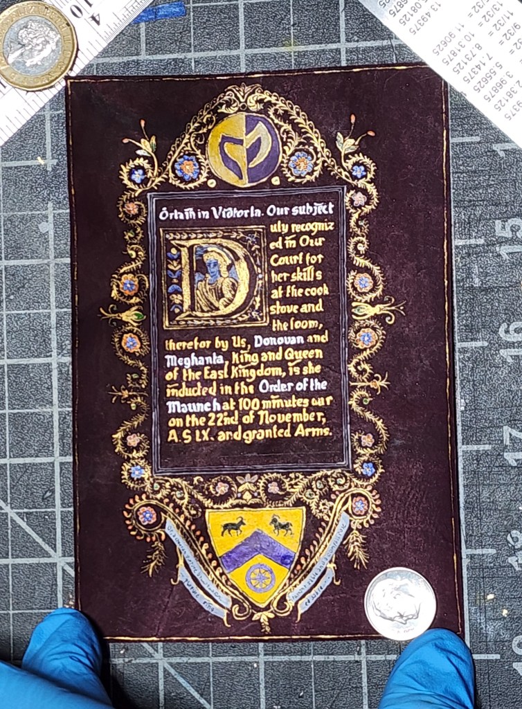 Completed SCA scroll for Órlaith in Viðforla, recognition with Order of Maunche, East Kingdom.