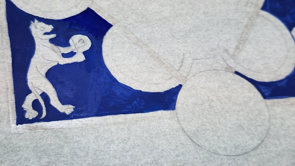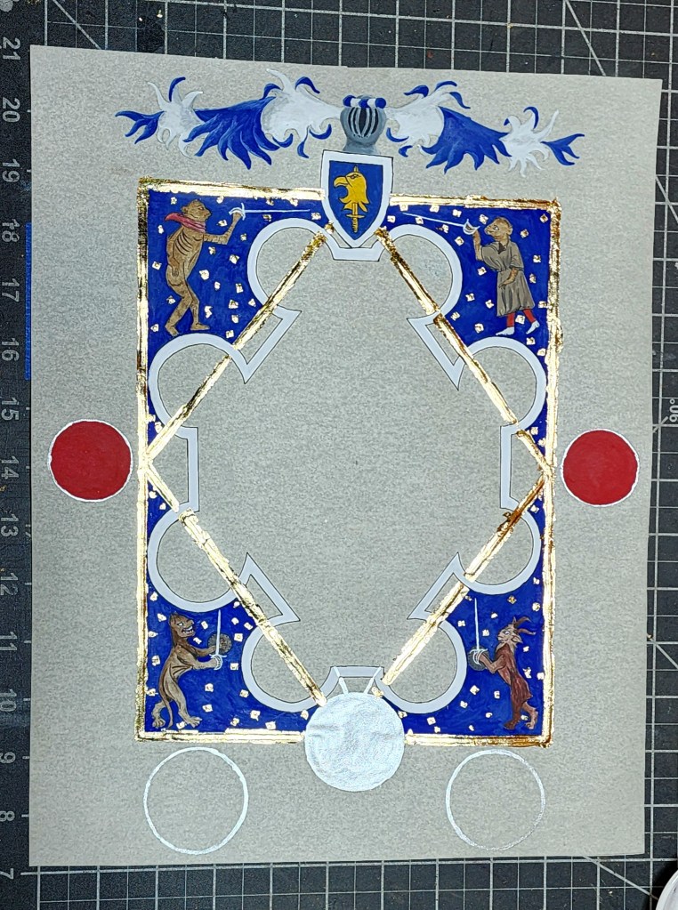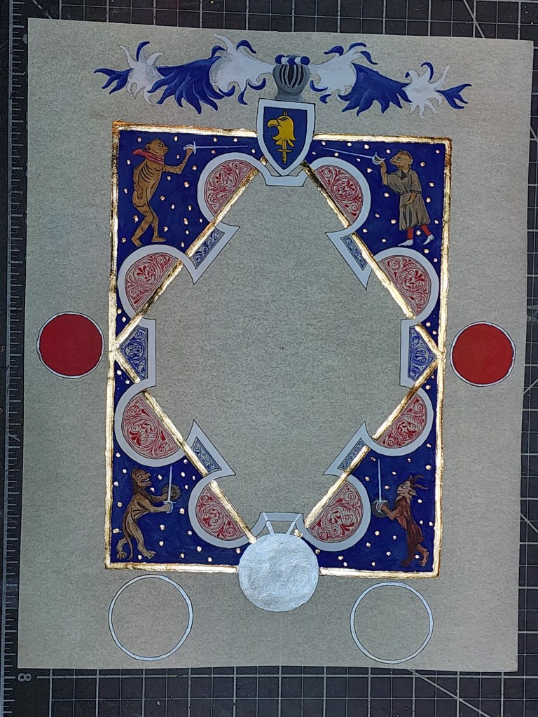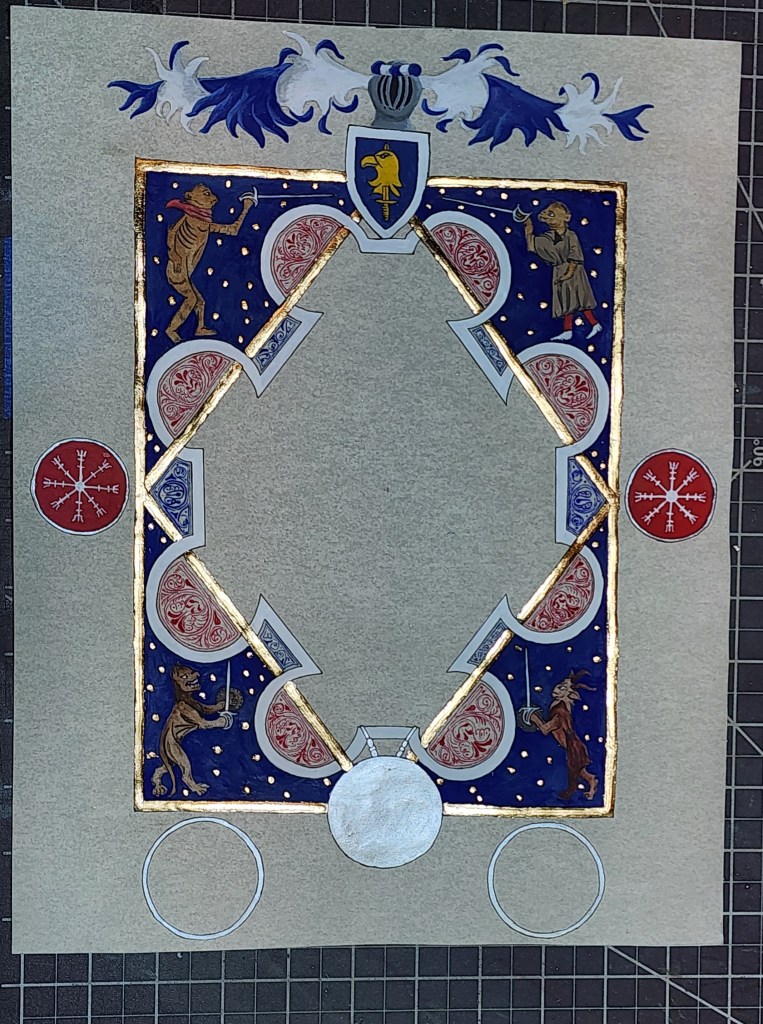 Choice made to add extra around border : achievement of arms and Mantling. Presence is Sca-ism, but also appropriate with Patent award of Arms, and had effect throwing overall balance of Scroll off. Rondels on side and below added to achieve more perception of balance – Badge of Kingdom Aethelmearc and spaces for Royal signatures.