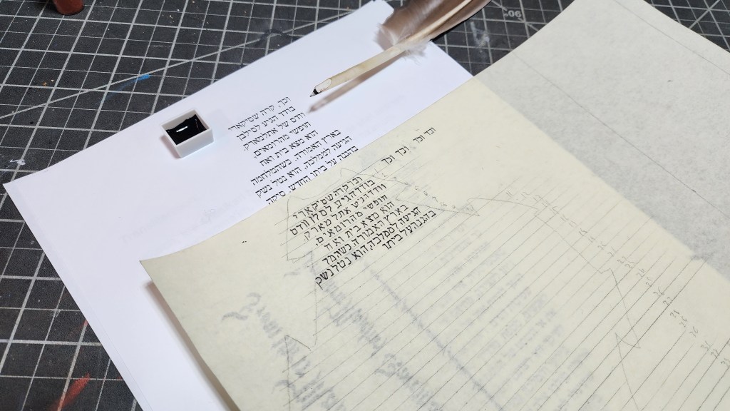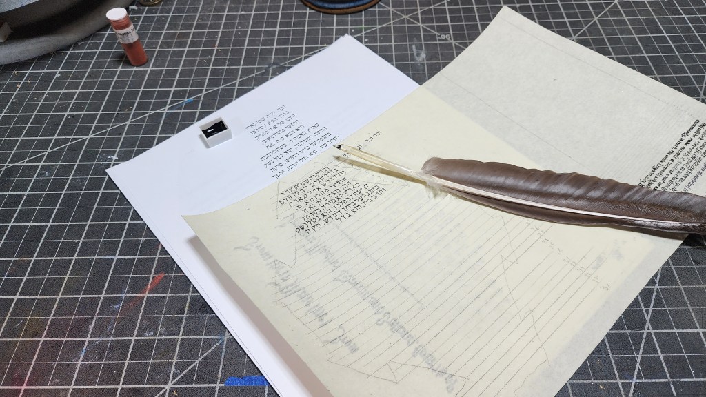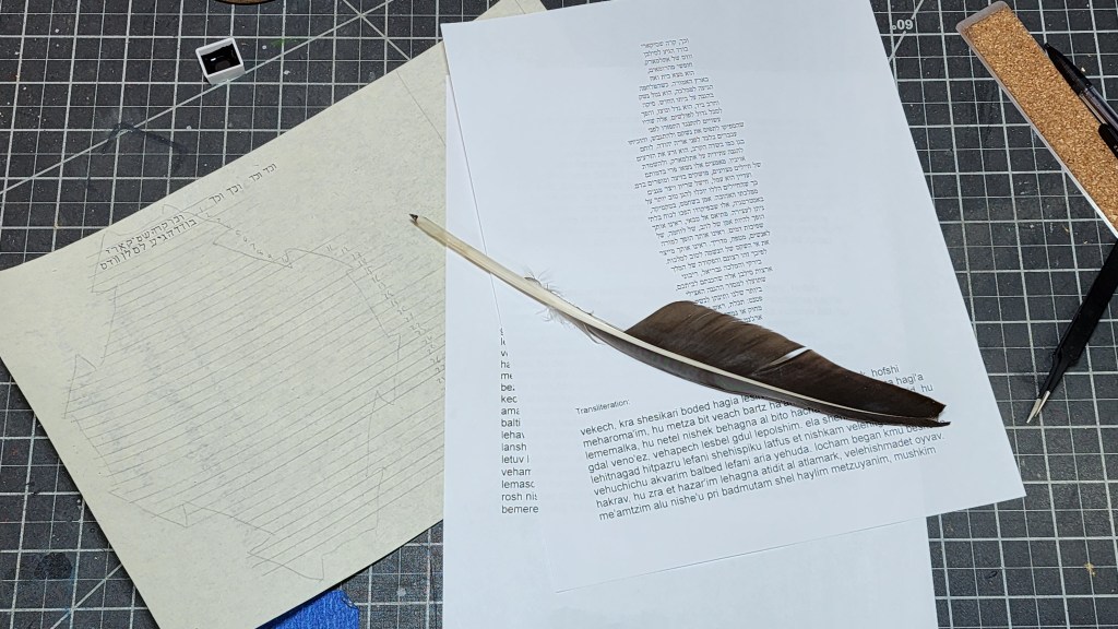 Big challenge doing hebrew. Unfamiliar with characters and words and spacing. Translation was shared electronically, and even with study of hebrew, limited time prevent becoming entirely familiar. Much to say on this part. Many practice sheets used to work on familiarity of flow and spacing. Calligraphy applied right to left, and practices achieved strokes. With time, practice and study, familiarity achievable to allow flourishes, etc. Not enough time available on project to achieve much other than comfort in primary strokes. May ask Patron for another assignment in this style – challenge being need trouble others for translations. We’ll see on that.