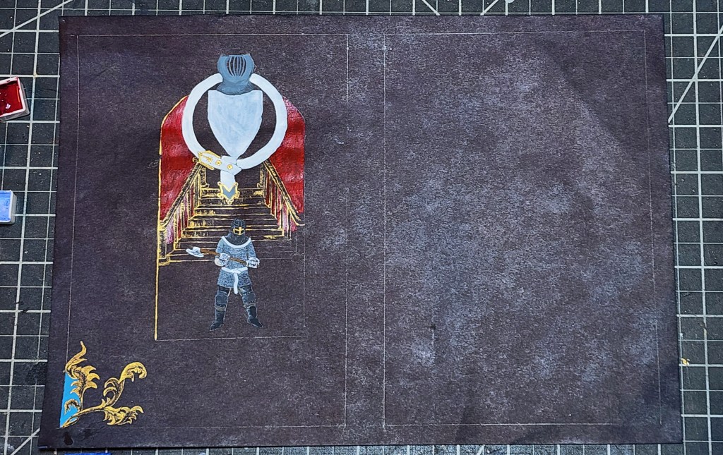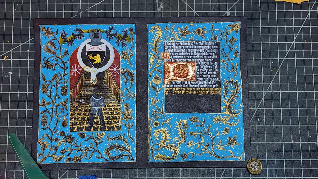 Challenges with period pigments binding to dyed pergamenta surface. Some pouncing needed and surface prep helped. Gold decoration and portrait work all done using shell gold, attempt made to imitate techniques and appearance of original. Pigment mix for blue background ultramarine, with white added to lighten and stand out. In retrospect, white add too much, and for future uses will layer pure ultramarine on black. Initial research appeared to have lighter color, and test painting on black appeared dark. Further tests made after review show pure ultramarine aligns more with images of exemplar. Lesson Learned.