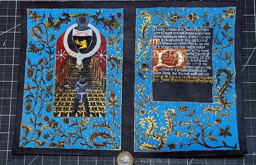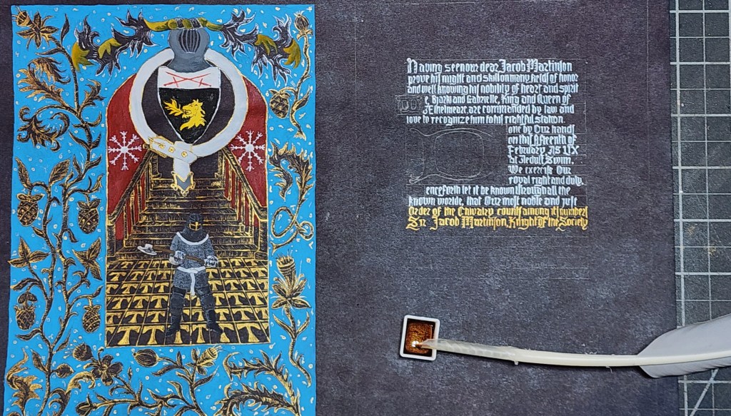 Having seen our dear Jacob Martinson prove his might and skill on many fields of honor and well knowing his nobility of heart and spirit, We Bjarki and Gabrielle, King and Queen of Aethelmearc are commanded by law and love to recognize him to his rightful station. Done by our hands on this fifteenth of February, AS LIX, at Aedult Swim, we exercise our right and duty. Henceforth let it be known throughout all the known worlde that Our most noble and Just Order of the Chivalry counts among its number Sir Jacob Martinson, Knight of the Society.