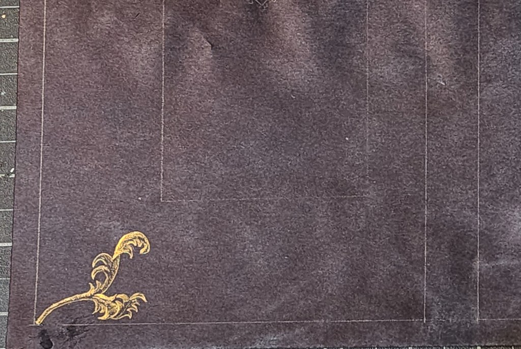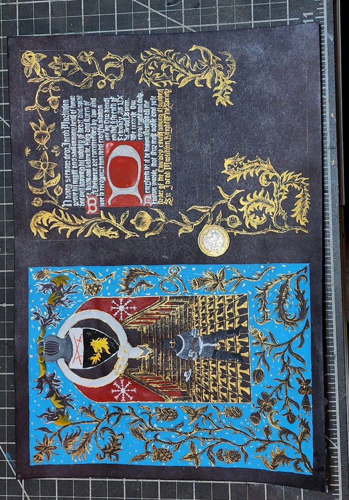Materials: Pergamenta dyed with oil dye. (Original vellum dyed with Iron gall) Natural and period pigments, gum arabic binder, shell gold and gold leaf. Calligraphy inks gold and silver applied with quill. Keeping appearance of original leaving limited space for text and illumination, requiring dyptich format.