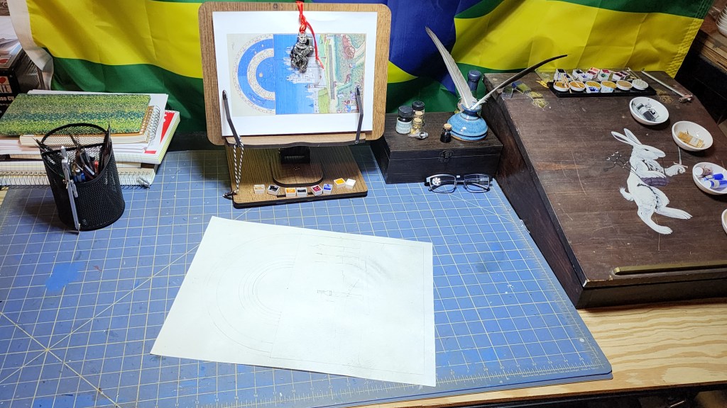 Calligraphy choice forced perspective. Result, nice idea, not as nice execution. Future lesson – cut down on verbiage, keep with original style for overall feel. Vellum resisted ink, requiring slow application of lines. Different cadence of ink application – one dip, one stroke, repeat. Overall, found this cadence good- will likely maintain as force of habit. Ink more consistent from quill, even with resistance from Vellum. Choice to put lower banner on bottom necessary for verbiage, could have leveraged to balance letters more.