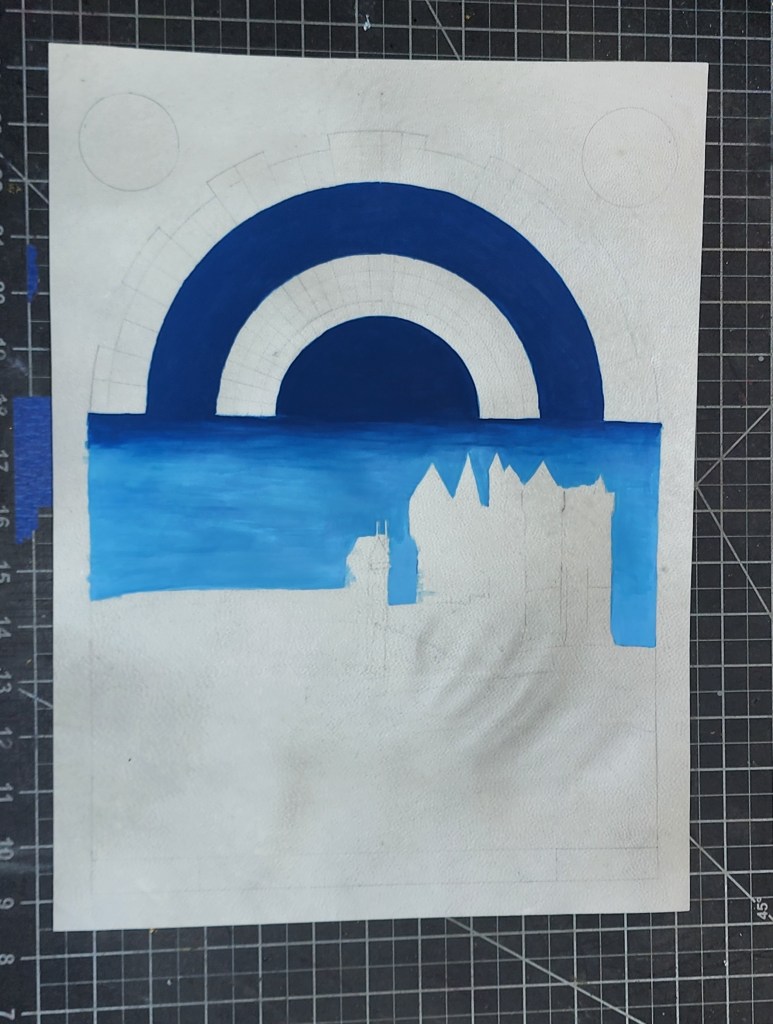 Variances of blue requiring several shading mixtures of pigments. Application being difficult to prevent re-activating previous layers. Quick, light strokes necessary, working in many layers one over other. Unable to achieve secondary base tint to left (under Virgo) on a uniform base, decision made: keep with deeper ultramarine for consistent background color. Lesson learned for future: need better brushes for wide swaths and more consistent mixing of lighter pigments. More blending practice. Time of essence, and limited times available per session hindered greatly. Methods and techniques require working within-session, specifially for large background areas or when color consistency necessary.