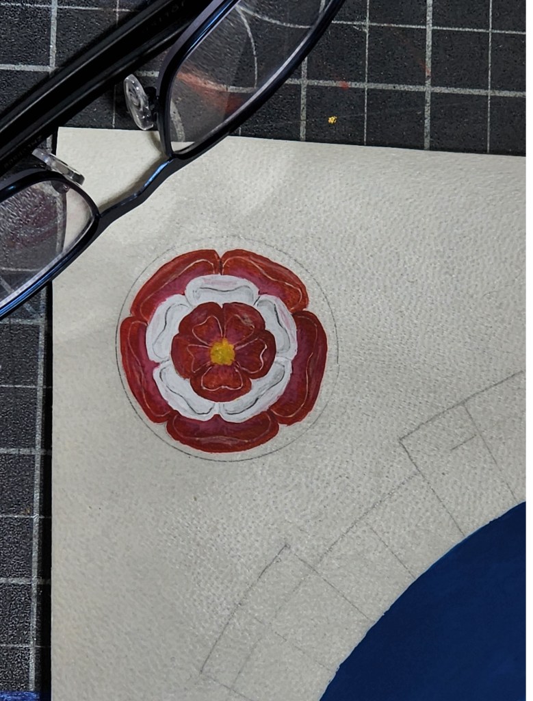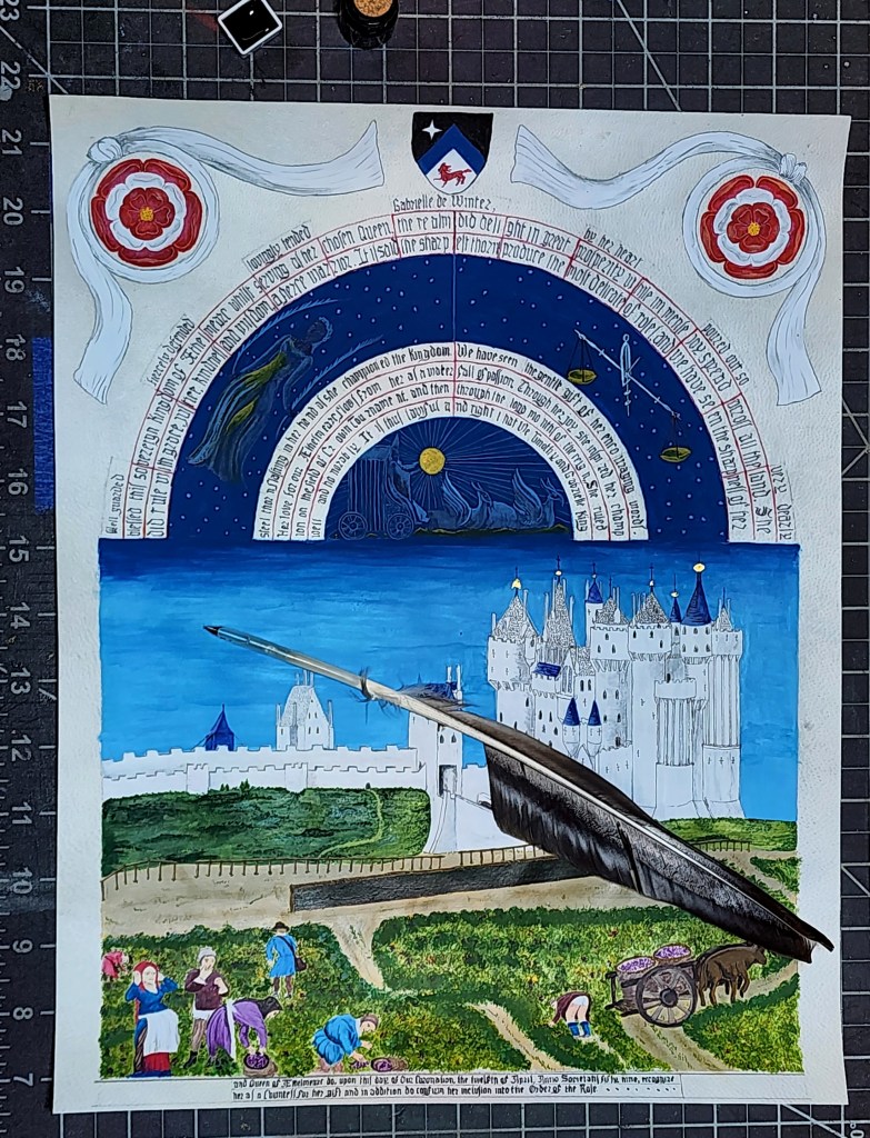 This commission require great departure from comfort zone. Design presented challenge. Original limited for verbiage space, liberty taken to maintain “style” while necessary sacrifice to calendar overall. Outside ring of text reworked to form embattlements of County Coronet for achievement. Balance of page left open upper corners, decision to fill with Roses enwreathed of White Scarves for meaning to recipient. Personal Arms direct center above, ends of white scarves imiate mantling frequently seen in Peerage scrolls. Choice intentional: Keep center image of carriage, griffons and sun duplicating original; change to which would alter overal appearance of main image.