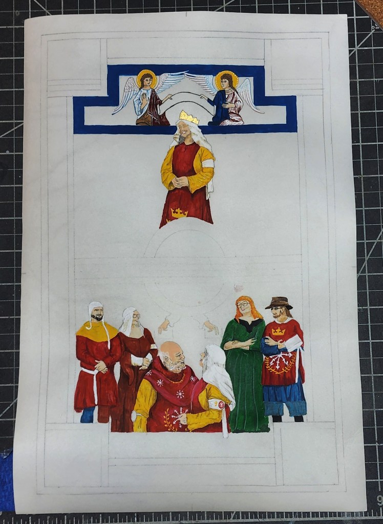 Style is combined technique – Base inspiration from Gospels of Henry the Lion, c 1173 with portrait work being done in later period more realistic-style. Directive for request was recipient is “12th Century with fondness for portrait work.” Given that, choice made for primary portraitures being realistic style – using images of Recipent, Champion, Heirs, Herald and Reign Seneschal.