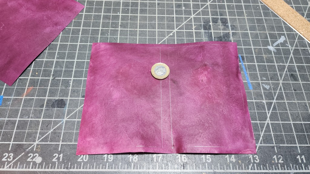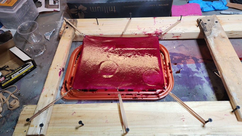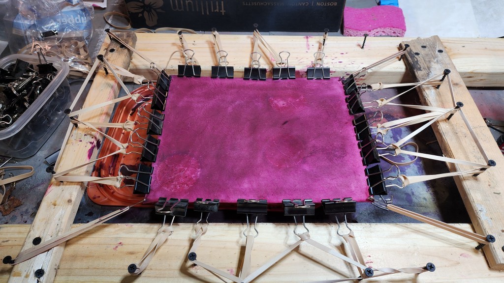 Results from dying: noted in final result, validation of mordant analysis for documents of period exemplar. Visible in result, areas where vellum held down by weight, mordant did not absorb into vellum evenly, and dye depth shows. Research indicates mordant and “painting” of purple dyed pages for period exemplars. Cochneal added with bits of oak leaves brings good purple-ish red. Further dye creation had added rust and sodium bicarbonate to ‘blue’ the hue – however choice made to stay with original batch as it has acceptable hue for desire.