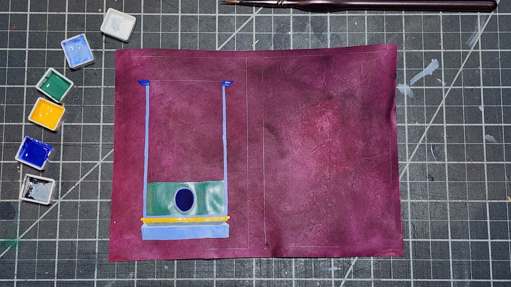 Original would have been orchil dyed vellum. Creation of orchil dye requires minimum of 4 weeks soaking in ammonia more like 6, and more time needed to distill into usable product. Given lead time constraint, choice made to use cochneal dye, while being a less lavish choice, was in-period opulent option and more rapidly created. The vellum for this example was dyed post-processing, in essence dying finished sheet. All these decisions are shortcuts chosen for time expediency given lead up to War.