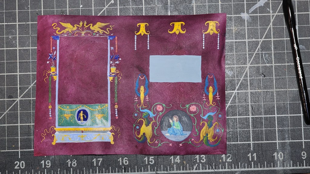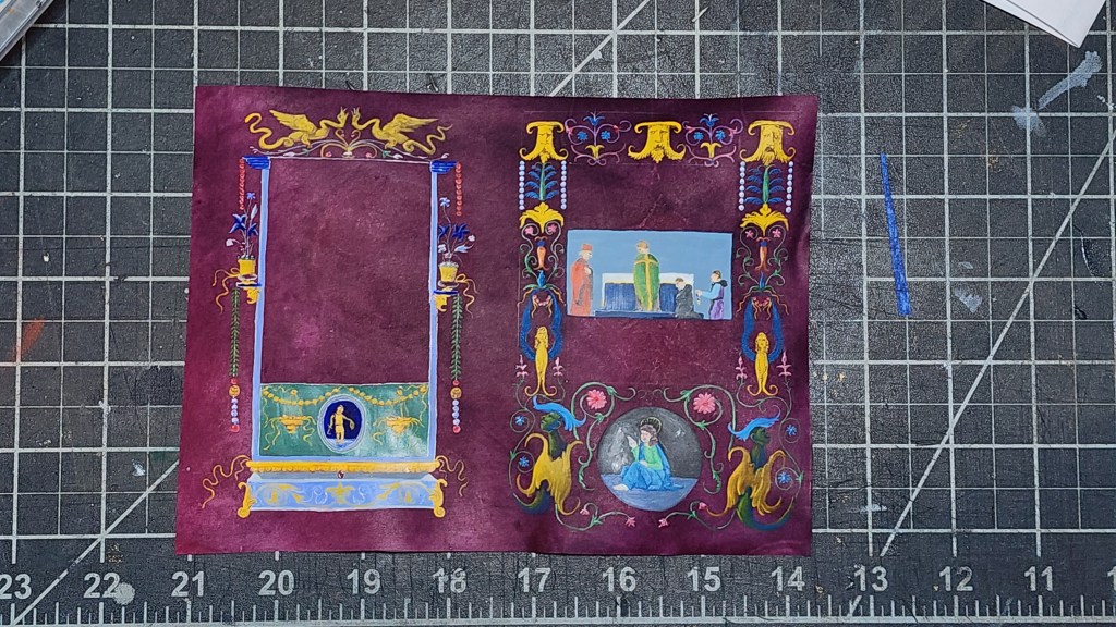 Style of exemplar is appropriate to period – italian. Gems, items, and realistic representation of subjects. Artist unfamiliar with style and techniques only a year on in practice. Spacing of verbiage require enough open space for calligraphy, limiting options for portrait. Choice made for inspiration specific for allowing limited practice and detailing on portrait technique.
