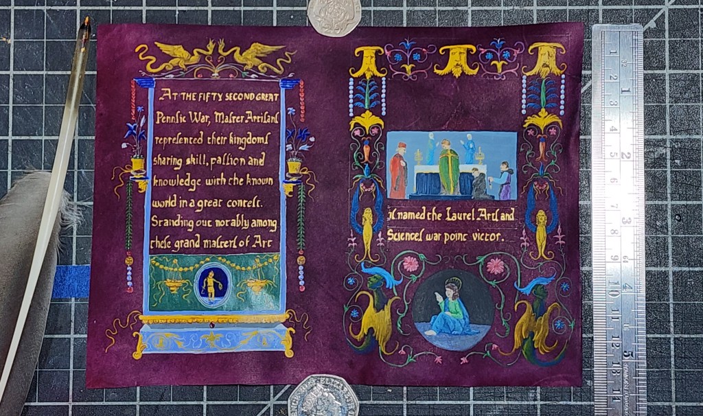 At the fifty second great Pennsic War, Master Artisans represented their Kingdoms sharing skill, passion and knowledge with the known world in a great contest. Standing out notably among these grand masters of Art, (NAME) is named the Laurel Arts and Sciences war point victor.