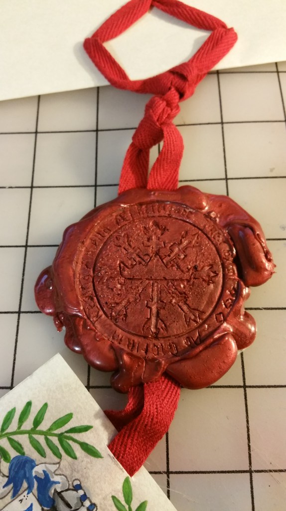 Per the request of Recipient – scroll is designed as royal document, based on Royal Grant Charter, circa 1300. Hand made seal for Byron and Ariella, Sovereigns at the time, hand woven band to attach the Patent of Arms illumination granted by Crowns.